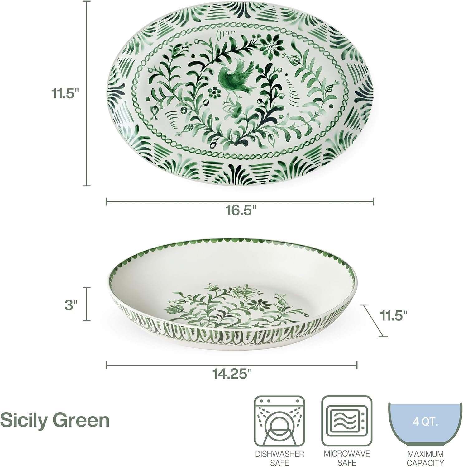 - SERVING SET: Includes one 4 quart oval serve bowl measuring 14-1/4 inch long by 11-1/2 inches wide by 3-inches high and one serving platter measuring 16-1/2 inches long by 11-1/2 inches width by 1-1/2 inches high