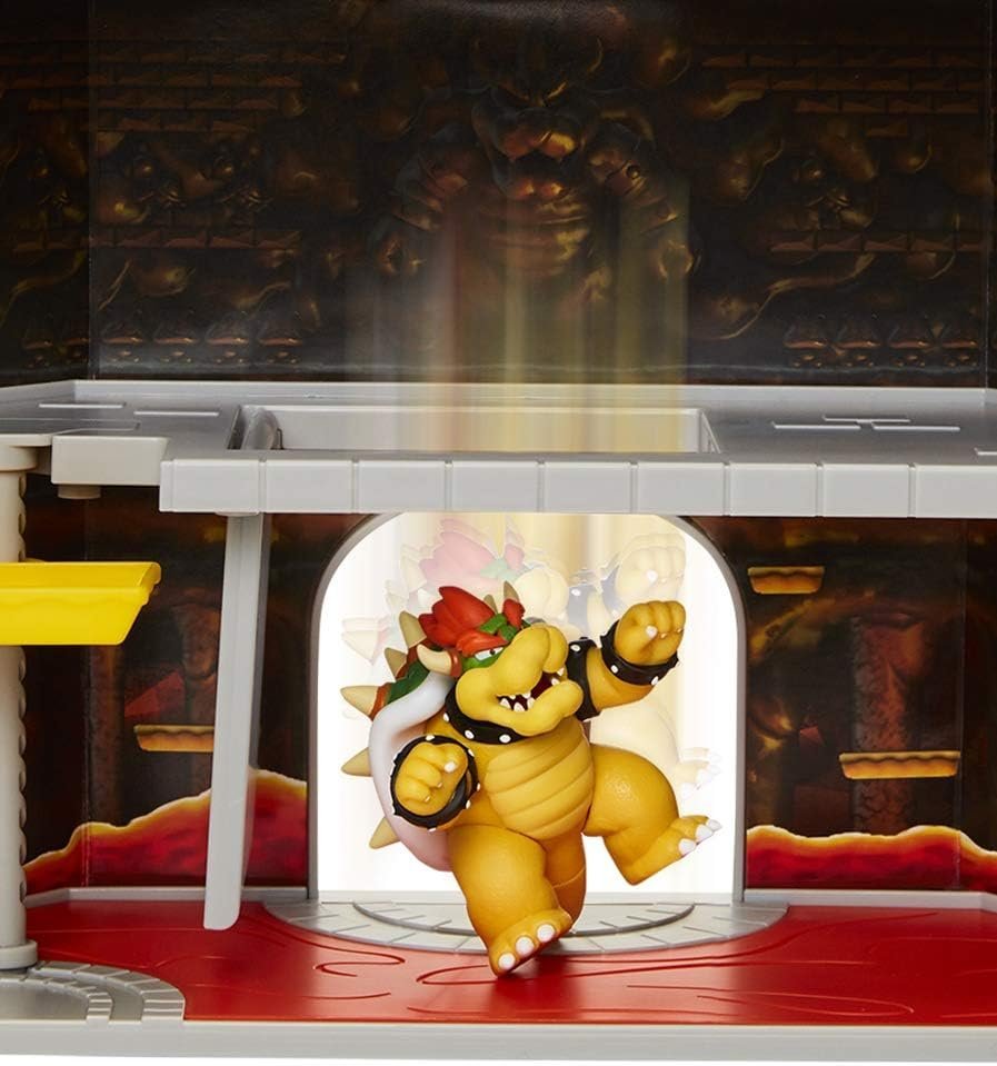 • Drop Bowser into the lava by triggering the trap door, or press down on the castle’s spire to trigger authentic in game sounds and music.