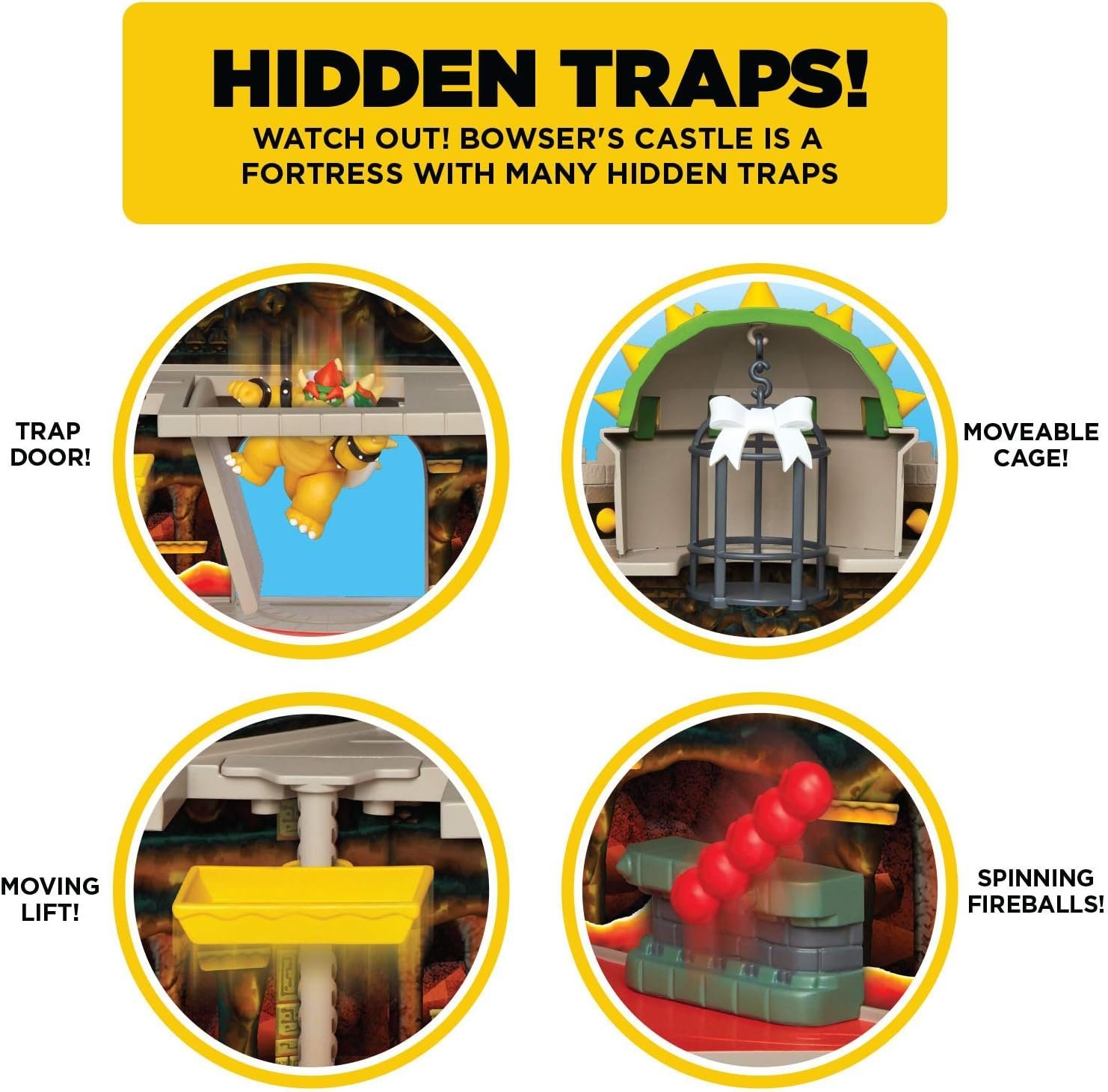 Explore Bowser’s interactive castle but beware of the hidden traps including spinning fireballs, opening cage, moving lift and trap door